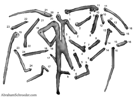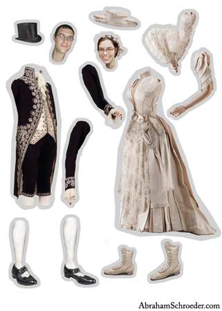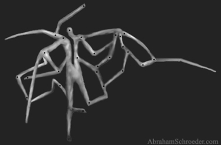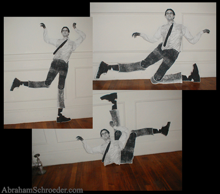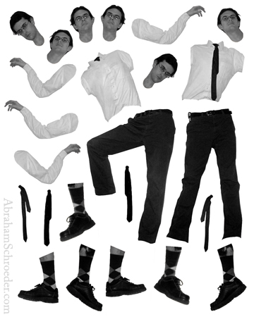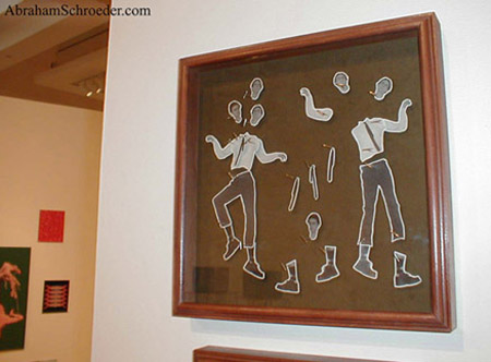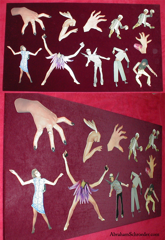 I've been making articulated paper dolls since about 1998 or 1999, and they tie in closely with my other body modification projects. The technology is similar to what I remember making in in elementary school with brads. I played with the idea a bit over the years, but the big inspiration was in 2001 when I found reprints of old French Jumping Jack toys in a Japanese art magazine. I photocopied and assembled them with gardening wire, and from that point I was hooked. Sometimes I make them with parts cut directly from magazines or cardboard packaging, and sometimes with photos and illustrations modified in the computer.